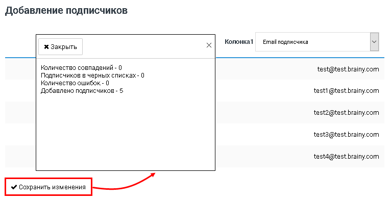 После добавления подписчиков одним из трех способов, описанных выше, откроется раздел "Добавление подписчиков", в котором отобразится список всех подписчиков. Нажмите на кнопку "Сохранить", чтобы сохранить изменения и увидеть уведомление о количестве добавленных подписчиков и другие статистические данные по результатам добавления подписчиков в список: