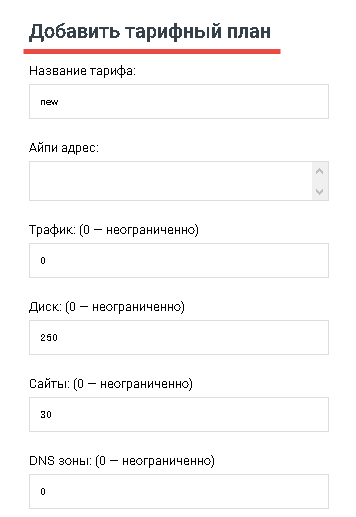 Чтобы создать тарифный план, перейдите в раздел панели управления "Управление"/"Тарифы хост-аккаунтов".